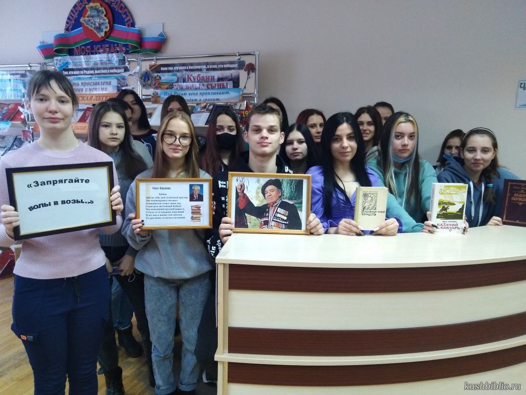 Сотрудник отдела по работе с молодёжью рассказала студентам Технического колледжа (группа 321 ф, 1 курс, парикмахеры, преподаватель кубановедения Бондарева Надежда Владимировна) о творчестве писателя. Студенты познакомились с поэзией кубанского поэта.
