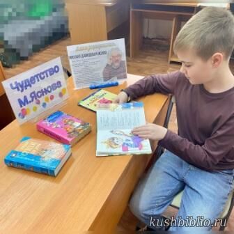 К юбилею писателя в детской библиотеке оформлена книжная выставка «Чудетство М.Яснова». Она знакомит с краткой биографией поэта. Прочитав самые известные и любимые произведения автора,вы погрузитесь в мир его увлекательных историй.Стихи Яснова о природе учат замечать ее красоту и наслаждаться ее звуками. Читателям представлены сборники поэзии из фонда библиотеки: «Мама, смотри на меня», «Чудетство», «В гостях у Свинозавра» и другие.