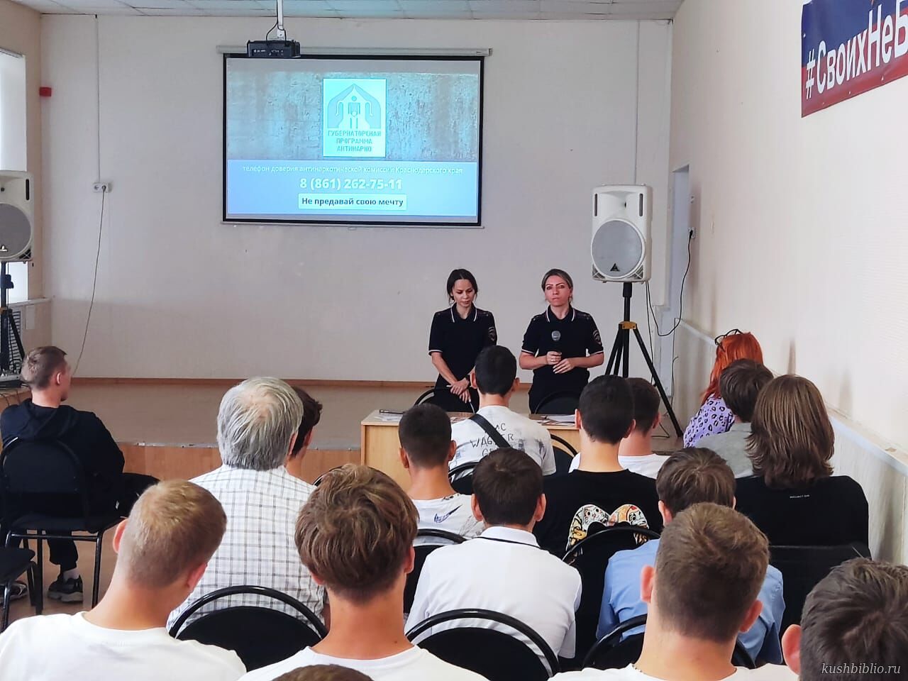 С беседой по вопросам профилактики правонарушений и преступлений среди студентов выступили Манукян Юлия Викторовна, старший лейтенант внутренней службы специалист направления по связям со СМИ ОМВД России по Кущёвскому району, Сутаева Русана Сергеевна, старший лейтенант полиции, инспектор ОПДН.