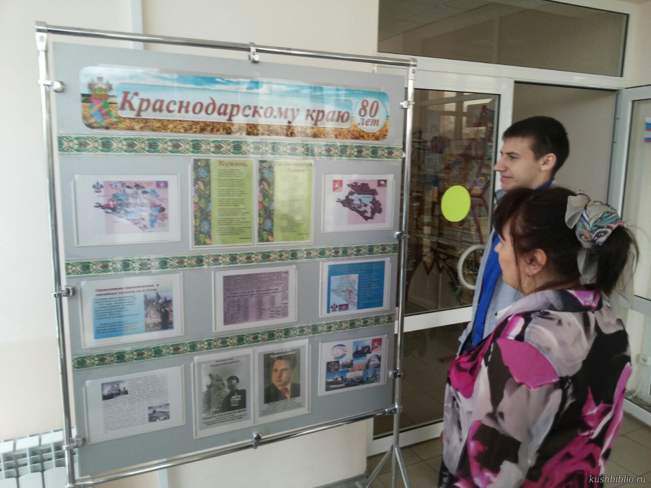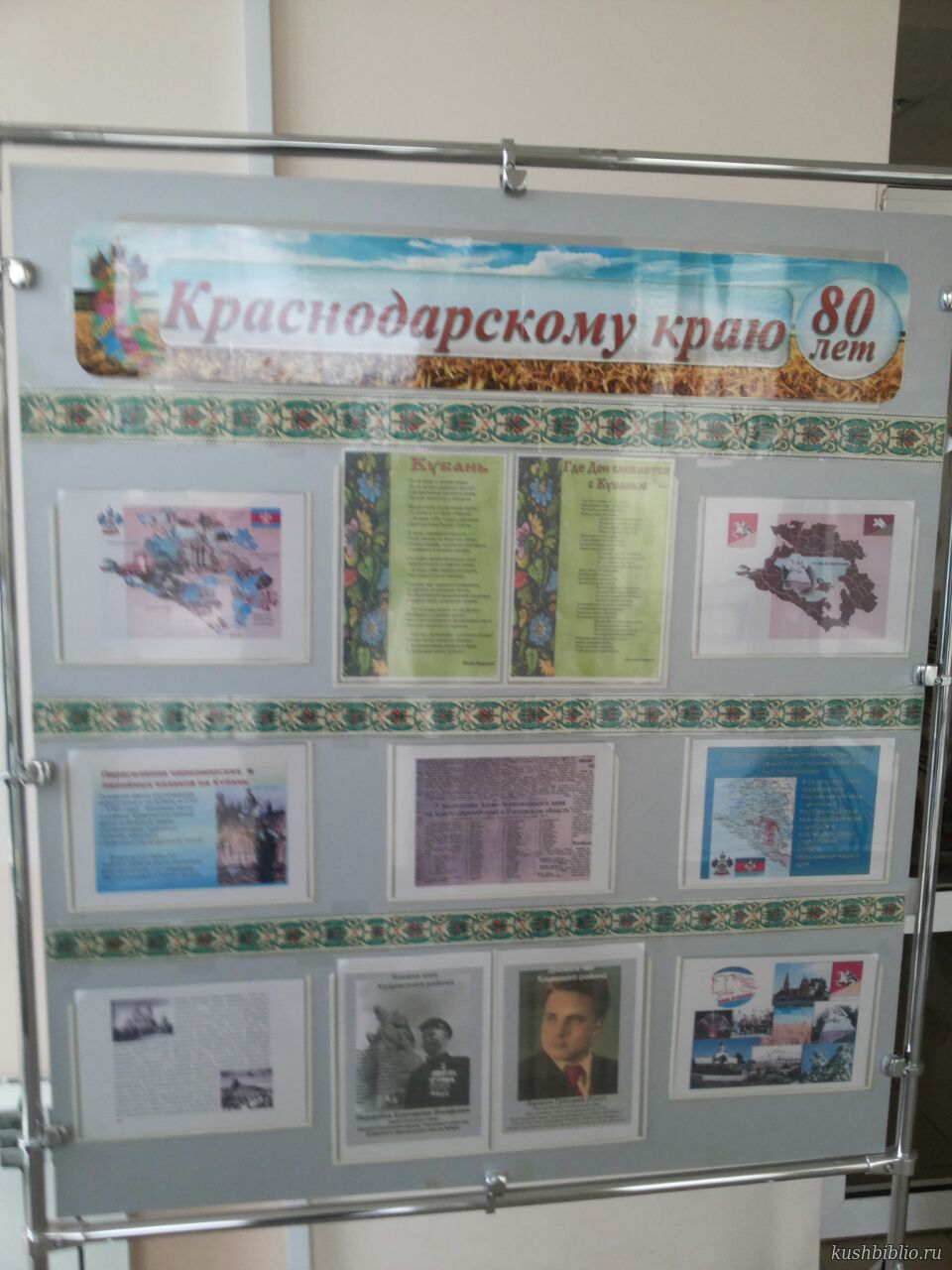 Для читателей МУК МЦБ представлен стенд, посвященный 80–литию образования Краснодарского края. На нем показаны символы Кубани, карта Краснодарского края и Кущевского района, а также стихи кубанского поэта Ивана Варравы и кущевского поэта Григория Баранова. В 1937 году было принято Постановление ЦИК СССР о разделении Азово-Черноморского края на Краснодарский край и Ростовскую область. Краснодарский край объединил 13 городов и 71 район с населением 2 миллиона 993 тысячи человек. Краснодарский край находится на юге России, входит в состав Южного федерального округа.Краснодарский край, чаще называемый по имени его главной реки Кубанью, занимает площадь, равную 76000 квадратных километров. Протяжённость края с запада на восток – 360 километров, что примерно в тысячу раз меньше расстояния от Земли до ближайшей к ней точки лунной орбиты.